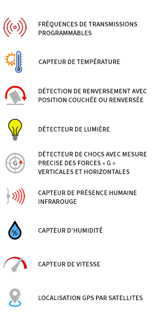 Grâce aux capteurs intégrés , il est possible de suivre les éléments ci-dessous avec une fréquence de transmissions réglables.